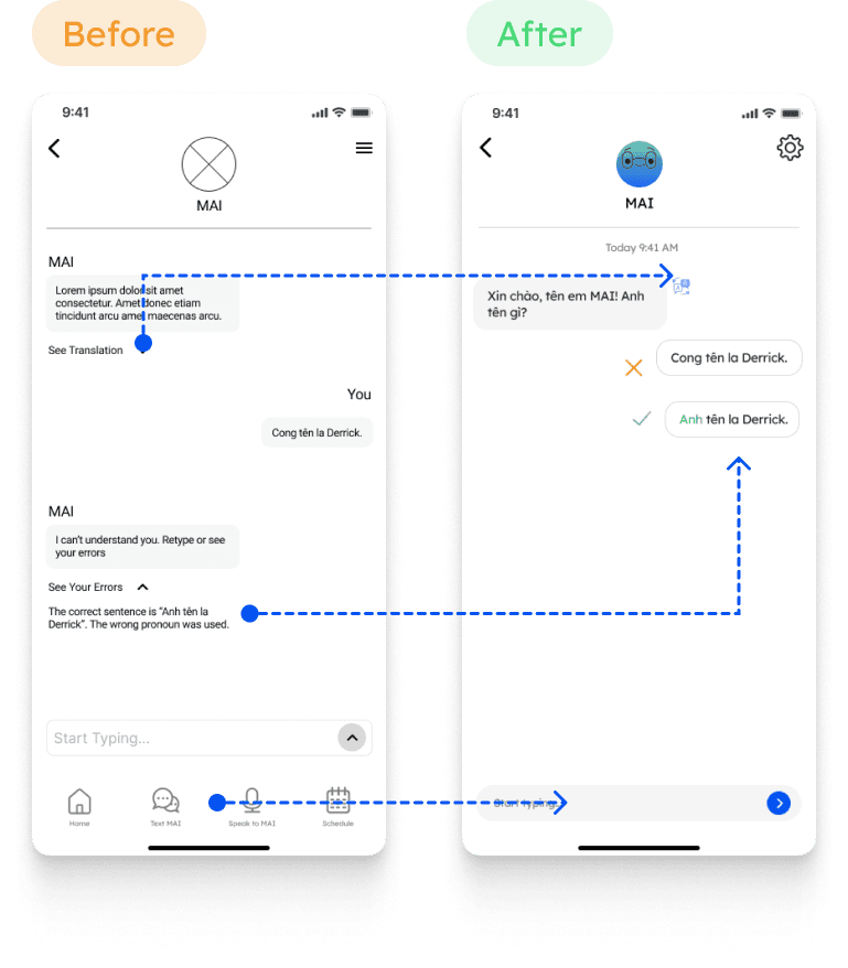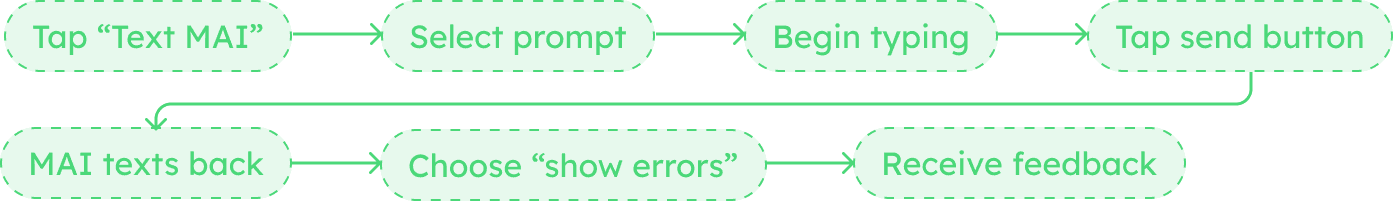 Users will be able to text MAI in order to practice comprehensible output and input through writing/reading. MAI gives users the option to view or fix their error before proceeding in the conversation.