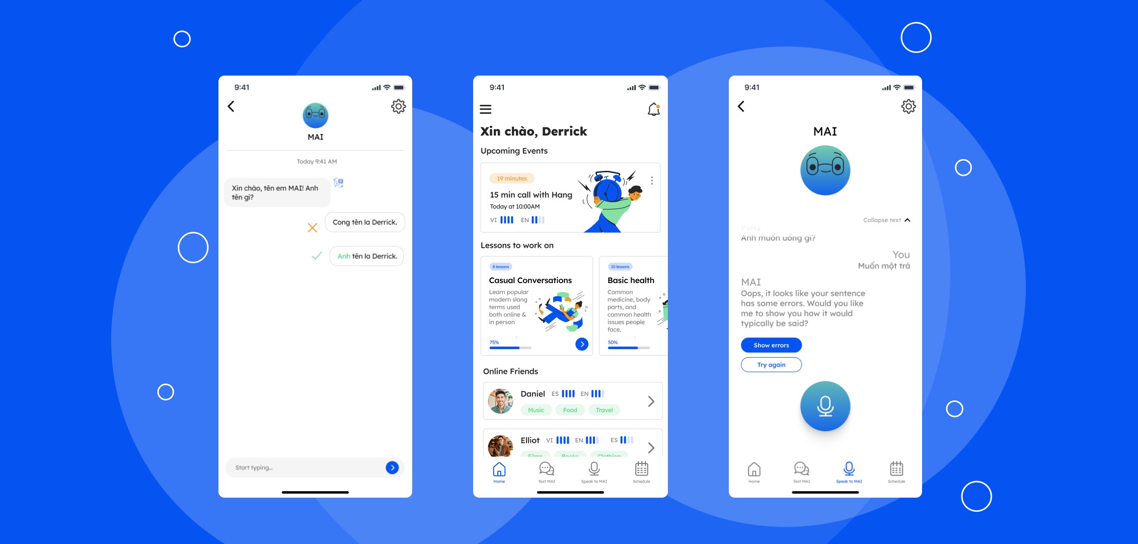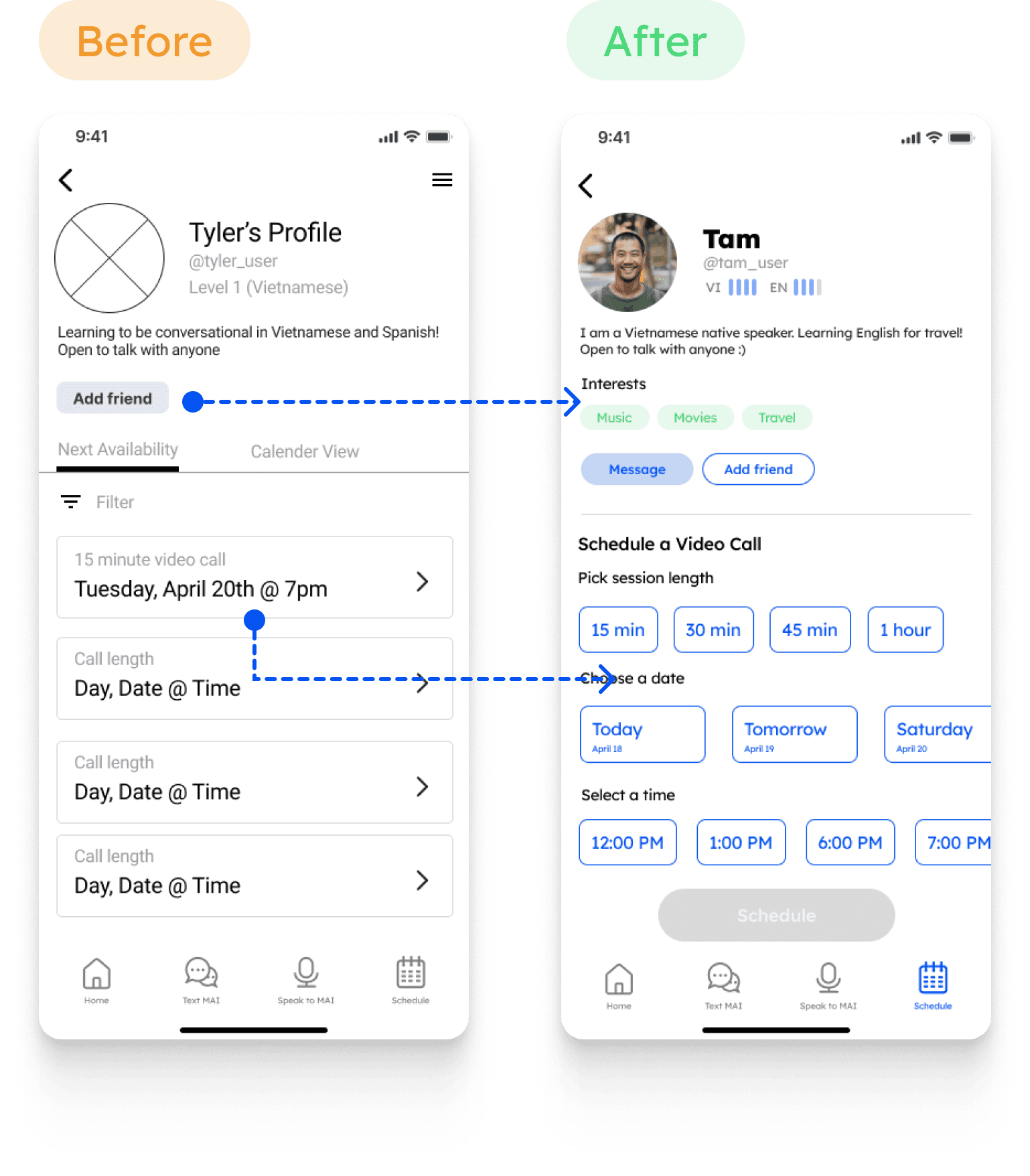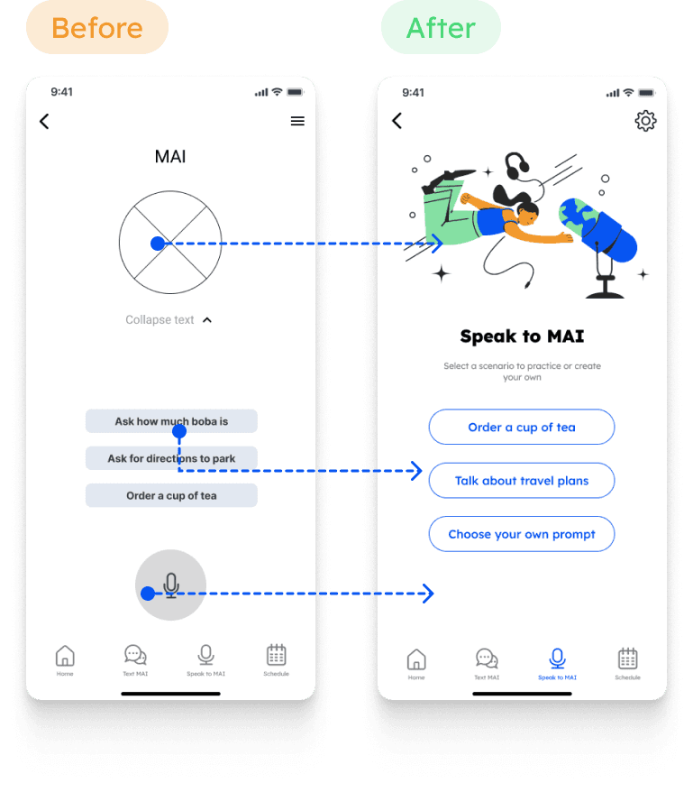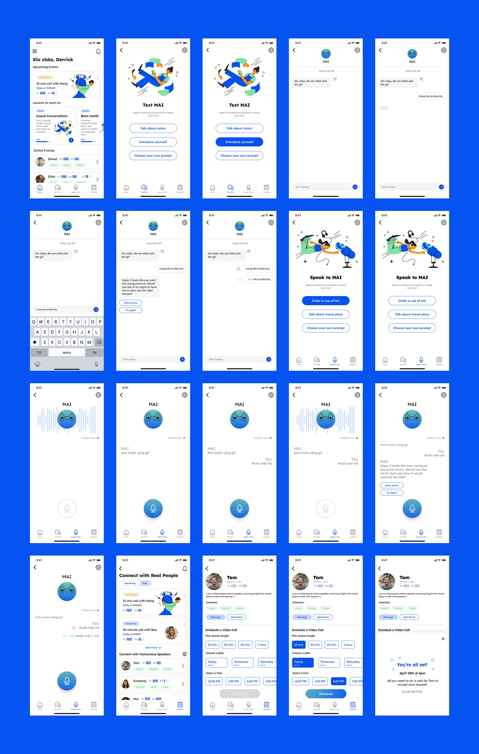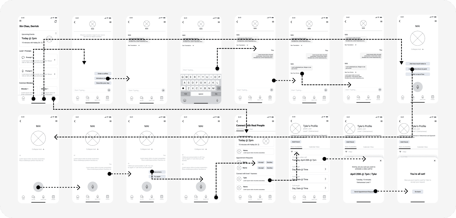 The final designs can be viewed below and in the prototype. MAI is the AI assistant that helps users practice their language skills.
