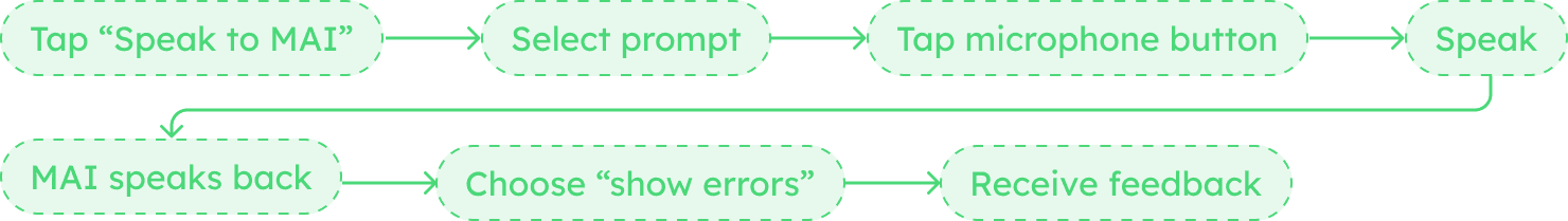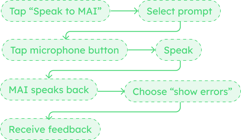 Users will be able to talk to MAI in order to practice comprehensible output and input through speaking/listening. MAI gives users the option to view their error or fix their error first before proceeding in the conversation.
