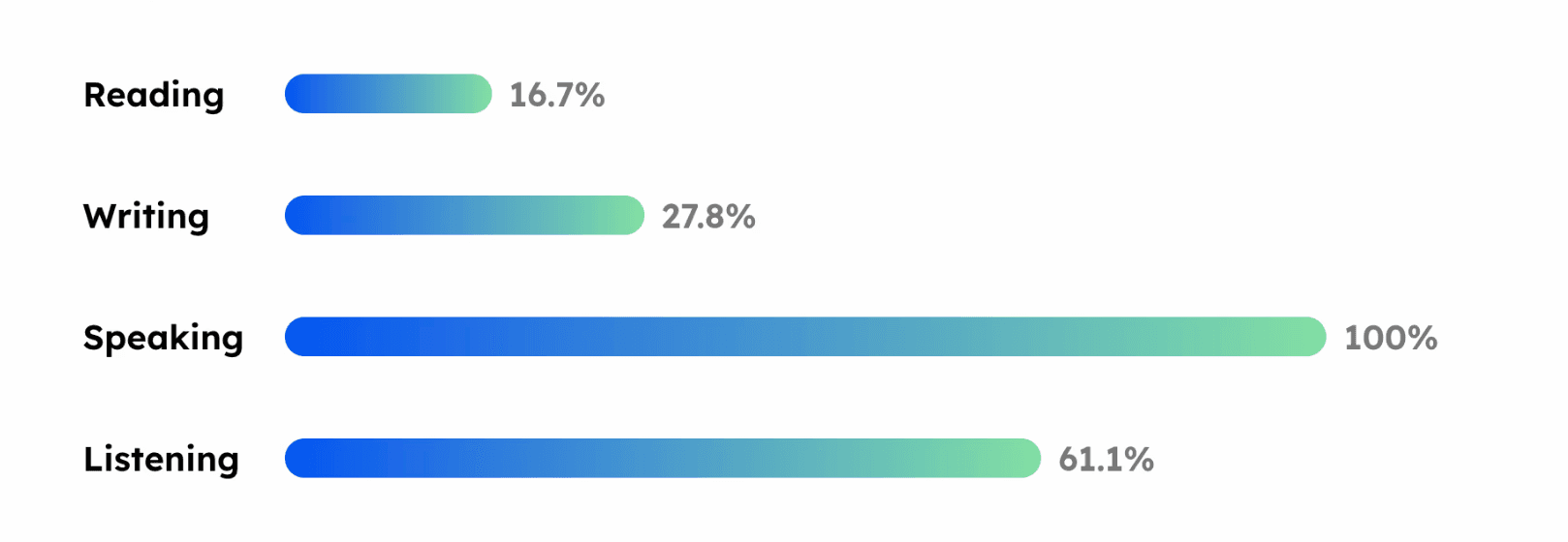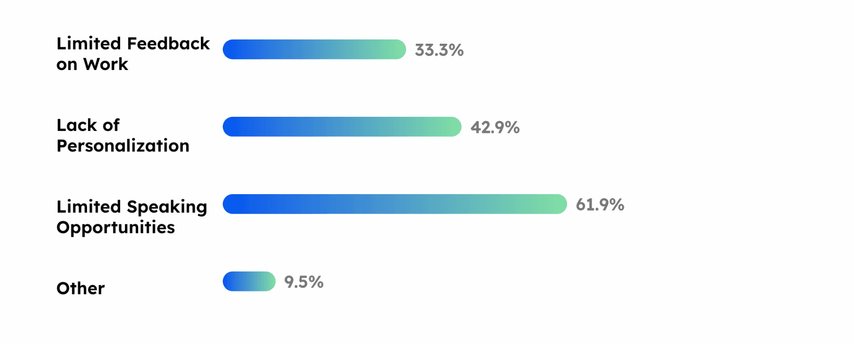 Only 10% of respondents reported being satisfied with their current language learning progress. Language learning improved 72% of the respondents’ lives, but 66% of them stopped learning.